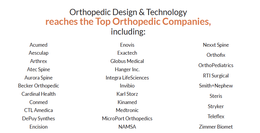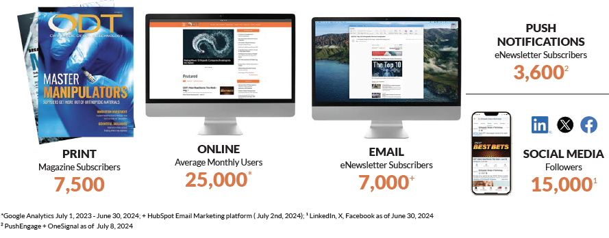 Orthopedic Design & Technology is the premier media outlet linking contract service and component providers with their orthopedic device manufacturer clients. Showcasing a well-established print publication—issued 7 times per year—the ODT brand continues to evolve across its digital media platforms through ODTmag.com and social media channels. Leverage a multitude of channels to maximize the brand’s reach to achieve your marketing goals.
