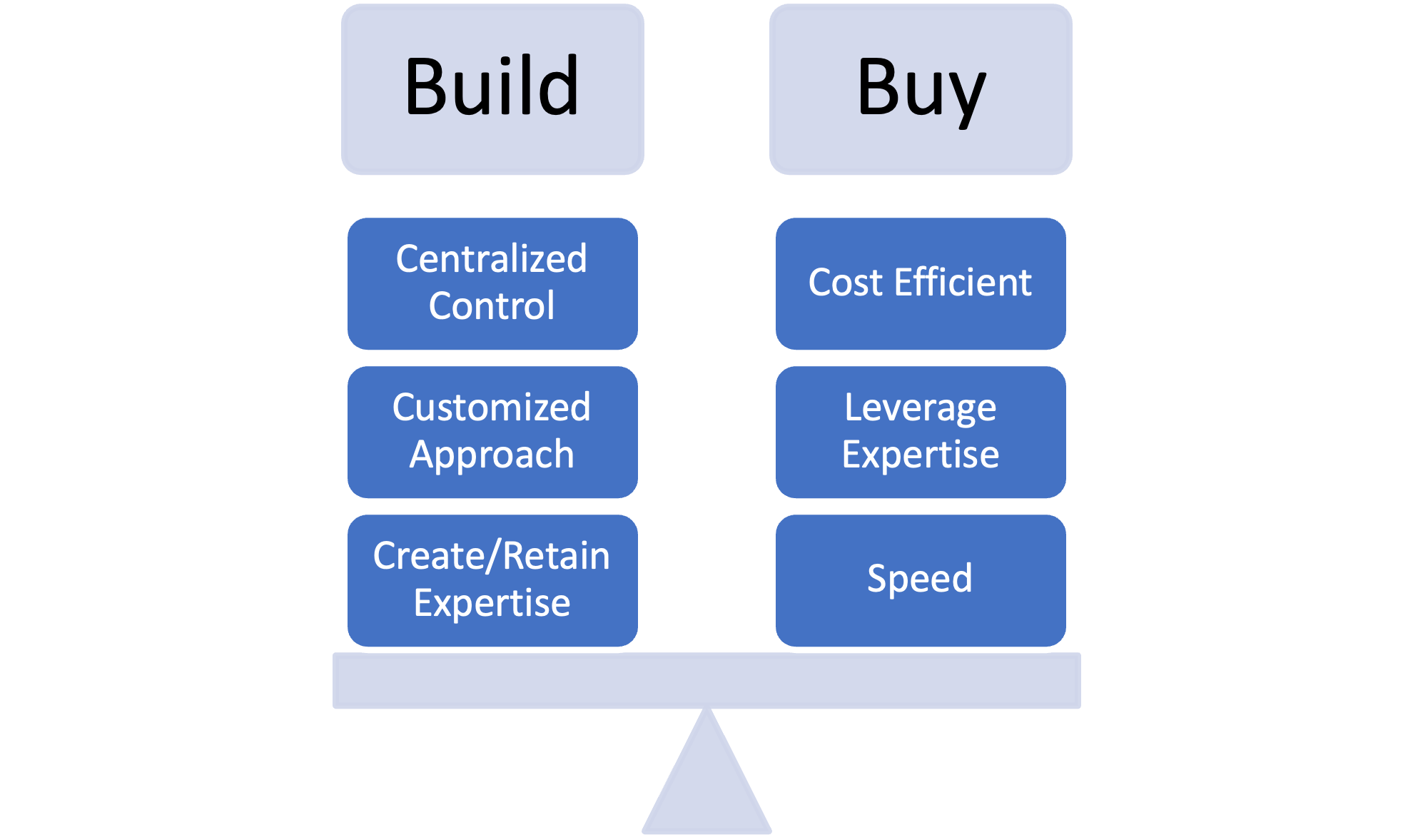 Figure 1: Build: Control and expertise are centralized; Buy: Speed and cost-efficiency take the lead.