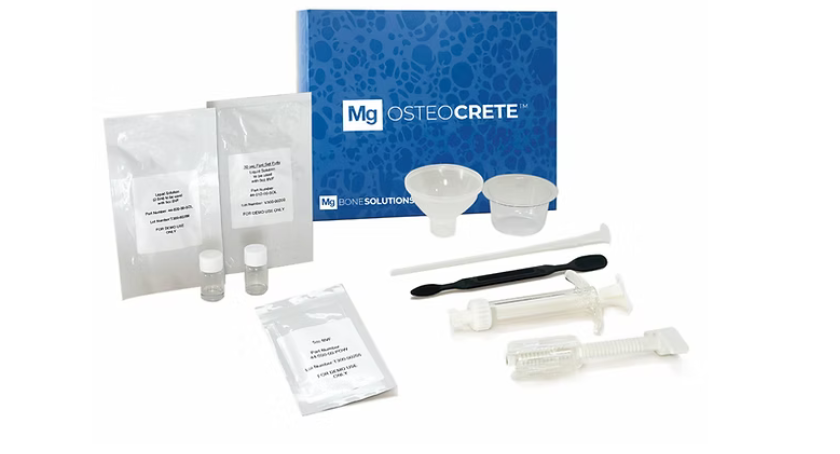 Mg OSTEOCRETE’s magnesium component is the significant differentiator from other bone substitutes on the market, company executives claim. The crystallization reaction from magnesium oxide and the blend of phosphate-based materials allows for the product’s ideal osteoconductivity. As a result, Mg OSTEOCRETE and Mg OSTEOINJECT set and cure in situ without migration. The material stimulates cell adhesion, proliferation, and formation of the bone extracellular matrix by osteoblast cells, thus promoting bone growth.
